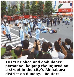 TOKYO, June 8: A man went on a stabbing spree on Sunday in a busy Tokyo neighbourhood famed for comic-book subculture, killing at least seven people and leaving around a dozen injured in Japan’s deadliest crime in years.