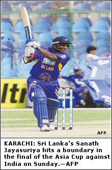 But the evergreen Jayasuriya, unperturbed by Sri Lanka’s precarious situation, was not going to be cowed down as he blazed in his typical fashion to put India on the defensive with an array of superlative strokes. After bringing up his 50 in 43 balls with a six over backward square-leg off Sharma, the 39-year-old left-hander — who escaped on 56 being caught off a miscued stroke at mid-on by R.P. Singh off Irfan Pathan — devastatingly disfigured R.P. Singh’s otherwise respectable first spell (5-1-24-0) by savaging him for 6, 6, 4, 4, 0 and 6 in one over when the left-arm seamer came on from the University Road End.