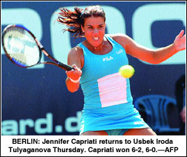 BERLIN: Jennifer Capriati continued her claycourt preparations by brushing aside Uzbekistan’s Iroda Tulyaganova 6-2 6-0 in just 43 minutes to reach the German Open quarterfinals Thursday.