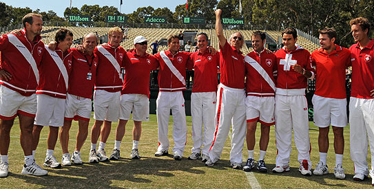 The pair resumed Monday with the Swiss breaking Hewitt in the first game back to close out the match 4-6, 6-4, 6-7 (9-7), 6-4, 6-3, putting the visitors in the 16-team World Group in 2012.