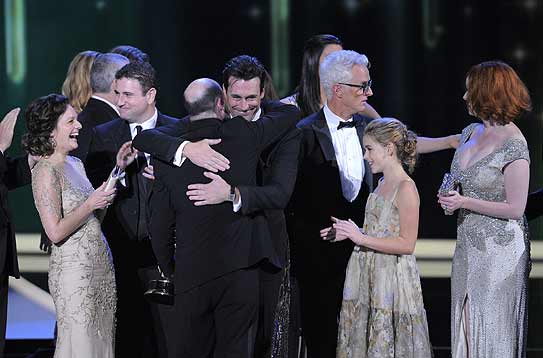 Cast and crew of Mad Men and creator Matthew Weiner, center, accept the award for outstanding drama series at the 63rd Primetime Emmy Awards on Sunday, Sept. 18, 2011 in Los Angeles. - AP Photo