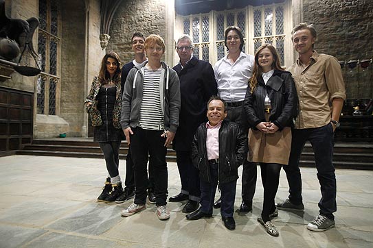 Actors from the Harry Potter movie series, from left Natalia Tena, Oliver Phelps, Rupert Grint, Mark Williams, Warwick Davis, James Phelps, Bonnie Wright, and Tom Felton, poses for photographs at the 'Great Hall' one of the sets of the movies during a tour in Watford, north of London, Wednesday Oct. 12, 2011. - AP Photo