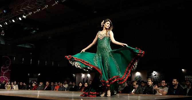 A Pakistani model presents a creation by designer Zeeshan Bariwal on the 1st day of Karachi Fashion Week in Karachi on January 27, 2013. — AFP PhotoDefined as sassy and chic, Shehrbano of Brands Just Pret put Iraj in a attractive, frilly number which she flaunted to perfection with her slick moves. Model Konain in a purple print silk shirt fused with black showed the line of practical wear with pleated churidars. Redefining denim, Element Jeans Co. is a regular at the KFW and Saima Azhar opened this segment in a seductive, short and frilly skirt with a leather belt around the waist. The collection featured a fun, frisky use of colour, jeweled motifs on jeans for men, a short, suede jacket worn by Rubya Chaudhry and jeans with featuring different textures such as stonewash, acid treated, faded, worn-out, tattered for the spring/summer season. Tops with glittery butterfly motifs and bubble-cut-flared jeans worn with electric red sequined halter top with feathered edging at the neckline stood out. Abbas Jafri in cowboy gear complete with lasso rope and a barrel gun was the showstopper for Element Jeans.