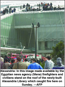 CAIRO, March 2: A fire on Sunday in the newly-built Alexandria library left nearly 40 people hurt, two of them critically burnt and the rest suffering from smoke inhalation, Egyptian police in the Mediterranean city said.