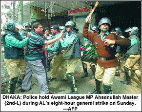 Armed police were stationed around the Awami League’s main office in downtown Dhaka even after the eight-hour general strike ended at 2pm, in the party’s first such protest since losing power in October.